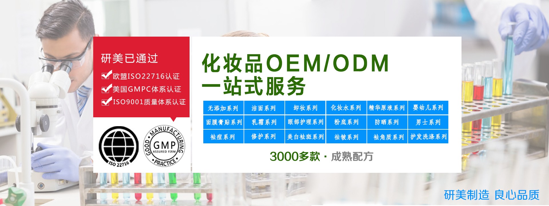 廣州市白云區(qū)研美化妝品廠由企業(yè)家陳昭武先生創(chuàng)建于2005年,是可芳化妝品集團旗下的化妝品加工廠。廠房占地面積約25000多平方米,現(xiàn)有16條化妝品生產(chǎn)線,生產(chǎn)員工300多人,研發(fā)工程師人員15人。工廠有GMP10萬級車間凈化系統(tǒng),全套乳化檢測生產(chǎn)設(shè)備,并通過了ISO9001質(zhì)量體系、歐盟ISO22716化妝品良好生產(chǎn)規(guī)范體系及美國GMPC體系認證。工廠與法國、德國、美國等歐美國家的原料供應(yīng)商、設(shè)備商合作,并長期與國內(nèi)相關(guān)科研院所共同研發(fā)優(yōu)良品質(zhì)的產(chǎn)品。工廠憑借成熟的生產(chǎn)工藝、專業(yè)的服務(wù)水準,贏得了廣大客戶的認可,目前已與國內(nèi)外一百多家專業(yè)線、日化線、微商電商品牌企業(yè)建立了合作關(guān)系,是化妝品OEM/ODM加工合作的理想企業(yè)。研美一直堅持誠信經(jīng)營、精益求精的經(jīng)營理念,致力于打造口碑良好的化妝品代加工廠家平臺,為廣大品牌客戶提供專業(yè)的增值服務(wù)。